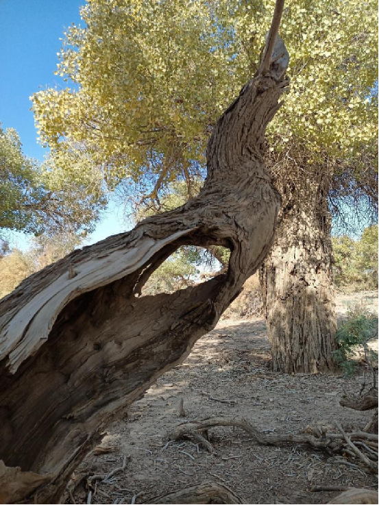 每當(dāng)深秋季節(jié),胡楊樹葉變得一片金黃,形成胡楊秋色,樹影婆娑,奇妙絕倫,賞心悅目。漫步在濃郁的胡楊林中仿佛進(jìn)入神話般的仙境。茂密的胡楊千奇百怪,神態(tài)萬(wàn)般。粗壯的幾人難以合抱,挺拔的七、八丈之高,怪異的似蒼龍騰越,似虬蟠狂舞,令人驚奇不已,嘆為觀止。僅就密密匝匝的樹葉,也是風(fēng)采獨(dú)有。幼小的胡楊,葉片狹長(zhǎng)而細(xì)小,宛若少女嫵媚的柳眉,人們常常把它誤認(rèn)為柳樹;壯齡的胡楊,葉片又變成卵形、闊卵形或三角形,猶如興安嶺的白樺;進(jìn)入老年期的胡楊,葉片才定型為橢圓形。更令人稱奇者,在同一棵胡楊樹冠的上下層次,還長(zhǎng)著不同形狀的葉片,因此,又稱“異葉楊”