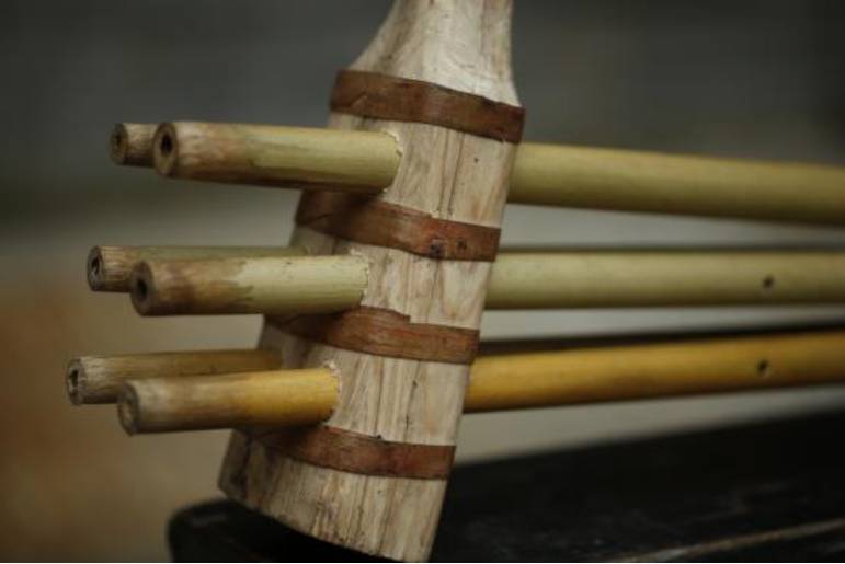 制作:蘆笙管用當?shù)胤Q蘆笙竹的竹子制作而成,管的兩端直通(有的地區(qū)蘆笙是上通下不通),按孔為方形(有的地區(qū)為圓形),簧片制作與其他地區(qū)蘆笙一樣;共六組合,用花果樹皮作兩道箍。