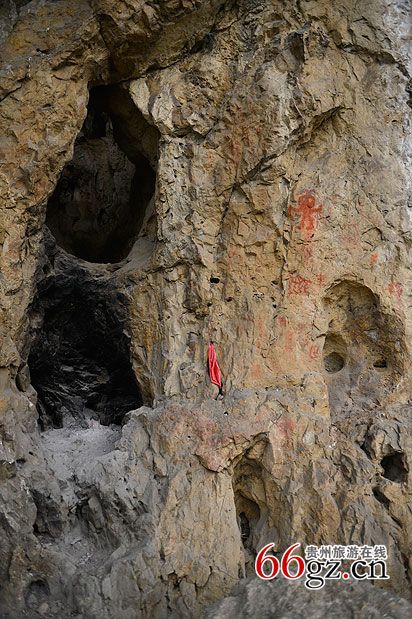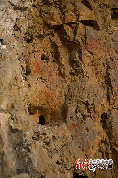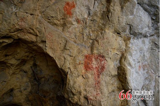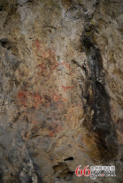 據(jù)資料載,金山洞古代崖畫以赭色涂繪人、馬、狗等等,隱約可見形態(tài)各異的大小圖像二三十個(gè)。人物多作行走狀,亦有雙手高舉者,似乎在祈禱。從其畫風(fēng)觀察,與相距不遠(yuǎn)的省級(jí)文物保護(hù)單位--長(zhǎng)順龍家院崖畫十分相似。