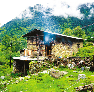 房屋大都是3層,上層存放干草和秸桿,下層關(guān)養(yǎng)牲畜,中間一層是居室。居室用木板隔間,里間較小是已婚子女住的,外間寬敞,是多功能堂屋。臨窗處設(shè)火塘,以利排煙,是家庭生活中心和待客之處?;鹛辽霞苤T大的鐵三角架,上面是六七厘米寬的鐵板圈,擦得錚亮,能烤制食物。墻角處供奉佛像,擺放領(lǐng)袖像。房門安設(shè)木鎖,用十幾厘米的木鑰匙開啟,都是由硬木刻制,光滑耐用。