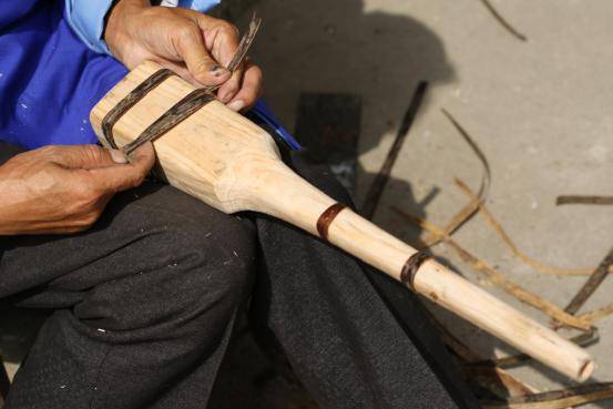 制作蘆笙大的工序有12道,再細一點有幾十項。如第一道是到山上去選竹子,拿尺子慢慢比劃,三拳的有多長,要很細心地選,確實可以用。取下來之后,第二道工序是拿到河邊去洗,用紗布搓。因為竹管有很多斑點,關(guān)節(jié)處有很多毛,要很細致的把那些東西全搓掉。弄好之后用太陽曬,曬干曬白。第三道工序,就是取杉樹的木頭做笙斗,計劃好做三拳的是多少公分,四拳是多少公分。十二道工序,后面越學(xué)越復(fù)雜,每一道工序都很講究。