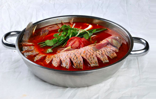 二、苗族人民自制的酸湯來煮的魚,酸湯是用清米湯發(fā)酵后制成的,有酸甜爽口味,是一種極好的調(diào)味品,煮酸湯魚的時候,將去膽的鯉魚,放入已煮沸的酸湯中,熟透起鍋前放入適量鹽、姜、生花椒和魚香菜等調(diào)料,5分鐘后把煮熟的魚夾進(jìn)菜缽,剔去魚刺,再把胡椒面、鹽、蔥花、蒜泥、番茄(番茄先在火上烤去生味,然后剁成醬作調(diào)料)調(diào)勻,倒入魚肉拌勻后食用。魚肉鮮香細(xì)嫩,麻辣酸香多味俱全,營養(yǎng)豐富,增添食欲,幫助消化。