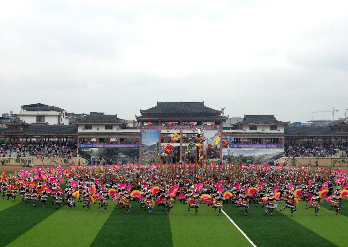 “錦雞舞”也是在銅鼓和蘆聲伴奏下,由中年以上的苗族婦女在銅鼓坪上表演的傳統(tǒng)祭祀性舞蹈,這個舞蹈充分體現了苗族人民自古對飛鳥圖騰的崇拜和向往。她們頭戴銀飾,身穿黑色短上衣,腰間束若干條五彩鑲邊,末端墜掛銀牌和流蘇似錦雞華麗羽毛的彩條長裙,臀部被高高墊起效仿錦雞高翹的尾羽。她們圍圓圈起舞,舞蹈動作緩慢,在或向前或向后的舞步中,模仿錦雞頻頻“踱步”“旋轉”和“飛翔”,隨動作變化而使腰間彩帶起落飄散的舞姿,把人們的心又帶回到遠古時代。象征鳳凰的“錦雞舞”,充分表現了苗族婦女為祈求民族富足和五彩人生虔誠而肅穆的場面。