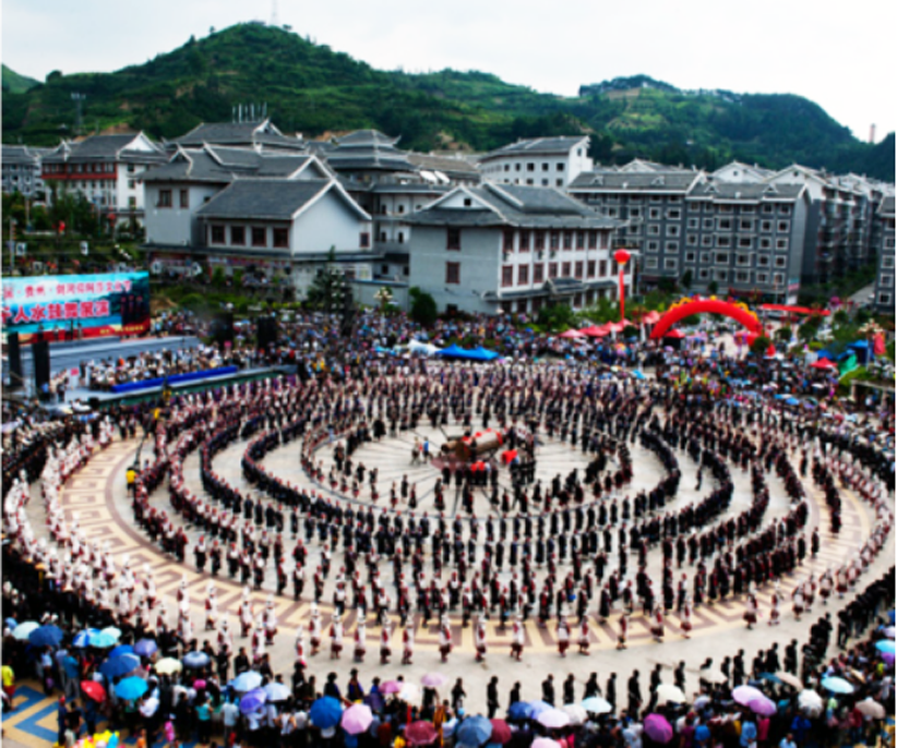 苗族的板凳舞主要流行于貴州革一、后哨、大塘、臺盤等地。是在走親訪友時,婦女們酒后隨興而起的一種舞蹈。舞蹈場地不限,或在某家里,或在寨壩上。這種舞蹈的伴奏樂器主要是板凳,因而得名板凳舞。舞蹈時有兩種跳法。一是由一名婦女敲擊板凳,其余婦女圍圈用雙手隨節(jié)拍拍手,雙腳輪換邊歌邊舞。歌詞內容結合活動內容隨興而編,但大多歌詞是圍繞攀親內容而唱。另一種板凳舞是參加舞蹈之人每人雙手各持一只凳子,集中在較寬的壩子上,一起圍著圈子轉跳,舞蹈動作是先走右腳用腳踉向外、前點兩點,與此同時雙手的板凳也擊兩下,之后收左腳向內、前點兩點,雙手板凳也即拍兩下。如此反復幾遍后,圓圈隊形又逐漸轉換為面對面并列兩隊形。舞蹈動作基本同前,舞時兩對面伸出右手持板凳相互擊一下,又換左手相互擊一下,二人在做這兩個動作時,各自的右、左腳跟也互換點地。之后,面對面各自轉身向外斜成“弓”字形擊了兩下,與此同時二人屁股相撞,百褶裙子飛揚。如此反復幾遍后,各人又邊擊板凳,雙腳同時起跳如蛤模跳躍狀,一邊手擊板凳,一邊與其他舞蹈婦女用臀部東擊西碰。如此反復狂舞,直到興盡方休。