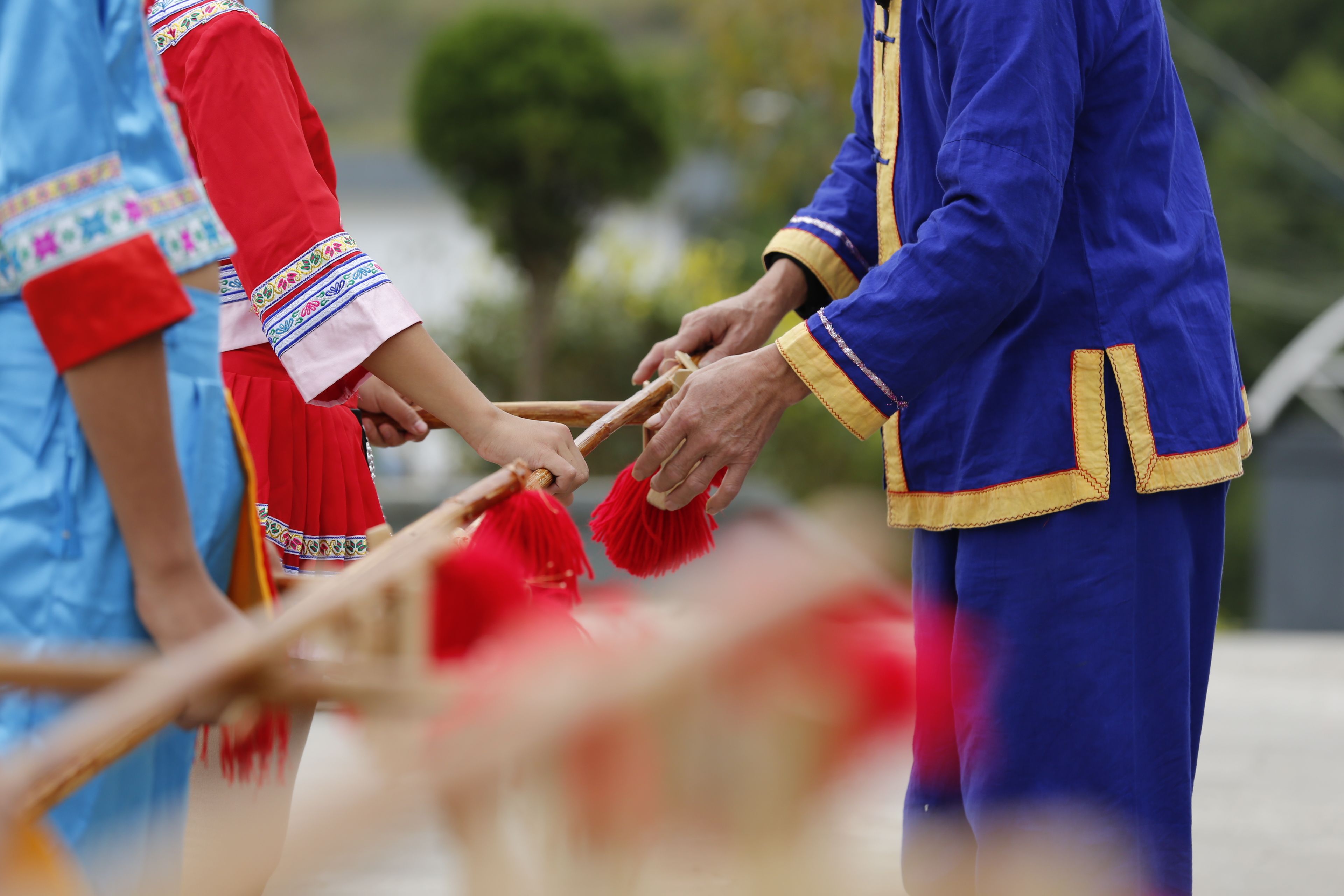 圖片說明:貴州貴陽(yáng)苗族長(zhǎng)竹舞傳承人教孩子們持竿手法